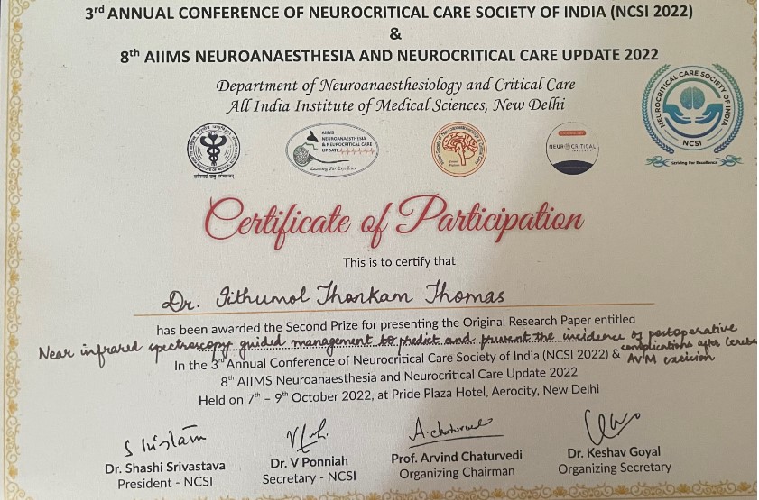 Dr. Jithumol Thankam Thomas, Senior Resident, Department of Anaesthesiology, has been awarded the Second Prize for presenting the Origianl Research Paper in the 3rd Annual Conference of Neurocritical Care Society of India (NICSI 2022) and 8th AIIMS Neuroanaesthesia and Neurocritical Care Update 2022 held on 7th -9th October 2022, at Pride Plaza Hotel, Aerocity, New Delhi.