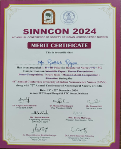 Sri. Rathish Rajan, Nursing Officer - B, Neurosurgery Ward (NSWRD) has won the 1st prize in Neuro Quiz in the 44th Annual Conference of the Society of Indian Neuroscience Nurses, SINNCON 2024, during 72nd Annual conference of Neurological Society of India (NSICON 2024) held at ITC Royal Bengal & ITC Sonar, Kolkata from 19th -22nd December 2024.